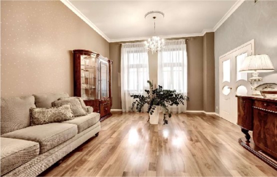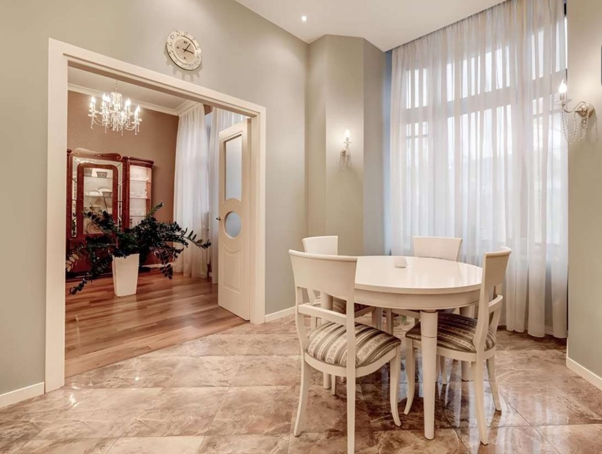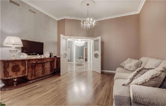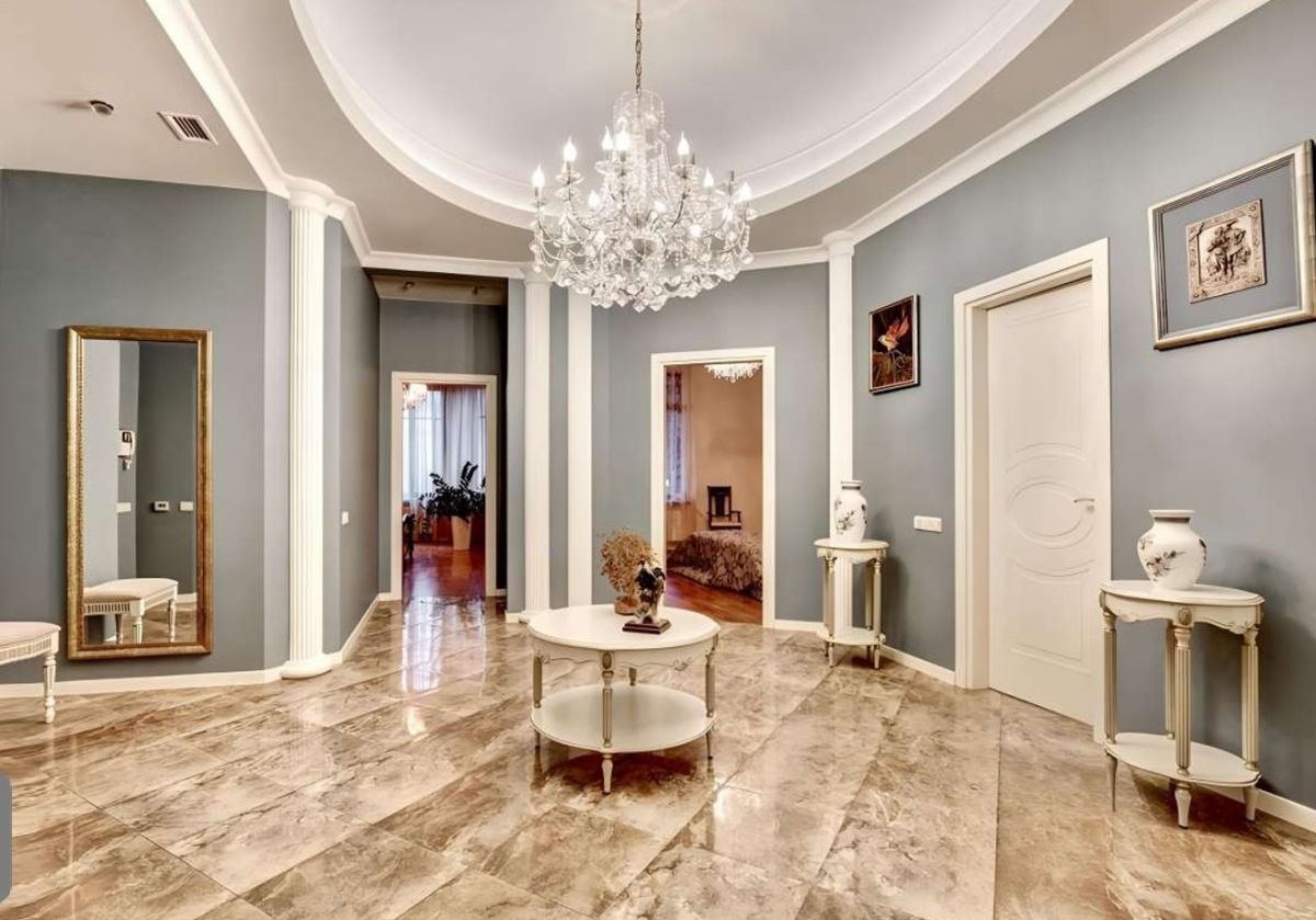 В квартире выполнен качественный ремонт в неоклассическом стиле. В отделке использованы ценные породы дерева и натуральный камень. Квартира полностью меблирована, оборудована встроенной техникой и кухней.